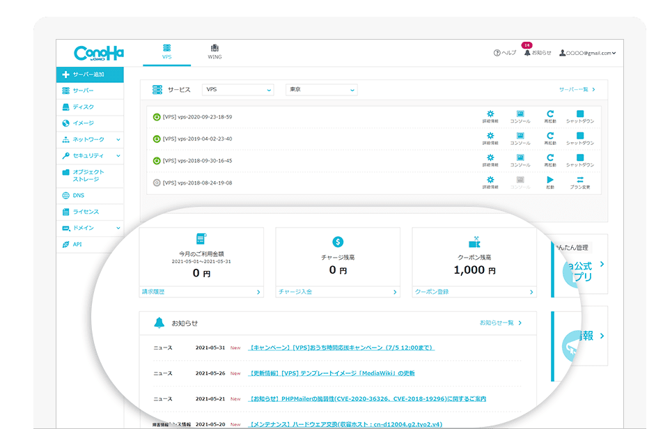 - 事前に入金したConoHaチャージの残高を確認できます。