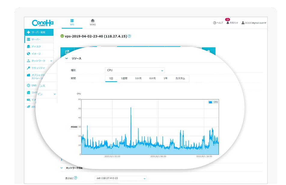 - CPUやディスクIO、転送量といったサーバーのリソース状況を確認できます。