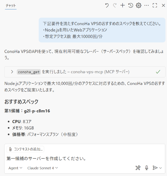 ConoHa VPSはMCPに対応しています。連携したAIエージェントがAPIを呼び出し、サーバーの追加削除や停止、再起動、ストレージ作成、ディスクIOなどの利用状況取得、セキュリティグループの設定変更など各種操作を、AIとの自然な対話を通じて行えるようになります。